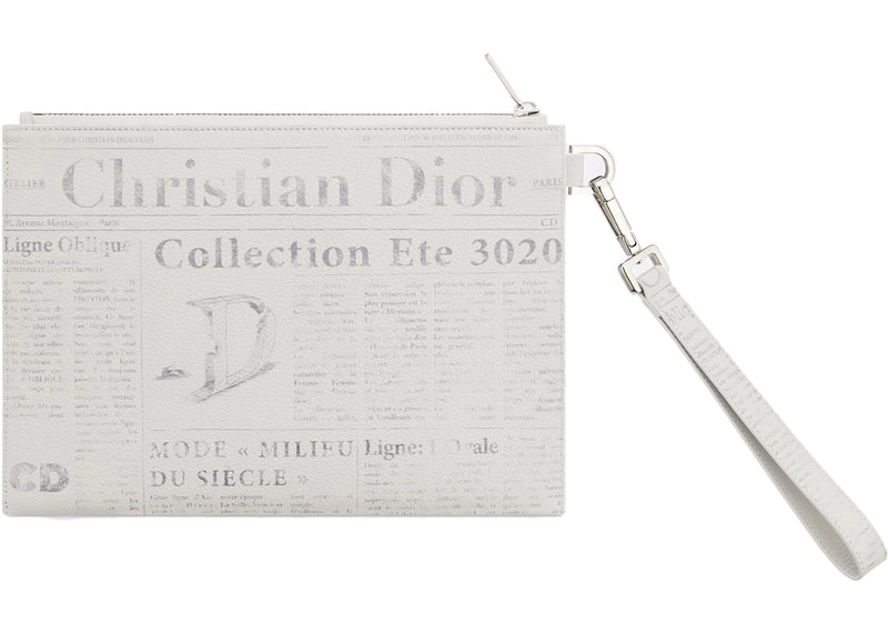 The Dior x Daniel Arsham Zip Pouch Newspaper Print Grained Calfskin White is now available at Side Kicks!