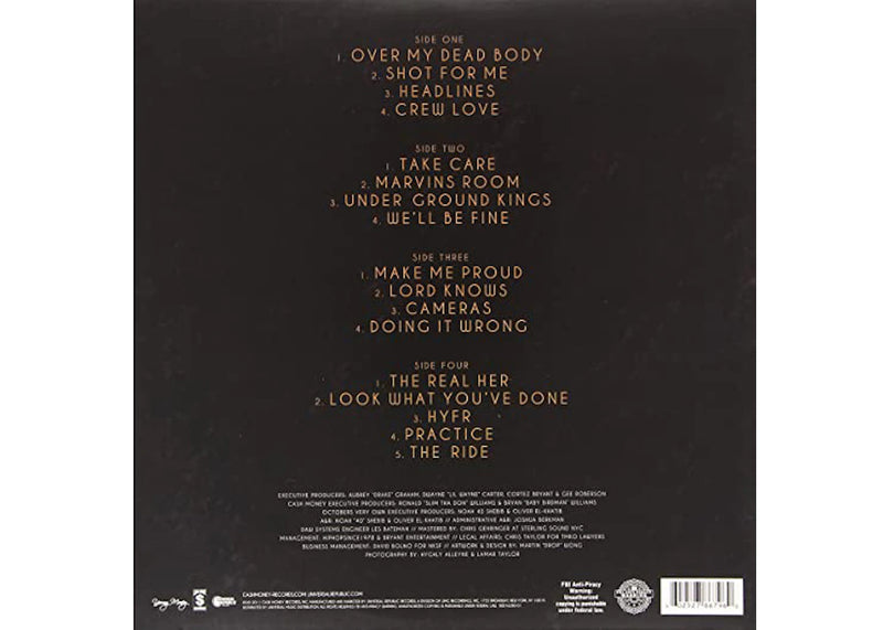 Take home one of Drake's critically acclaimed records with the Drake Take Care 2XLP vinyl. Released alongside the record's launch in 2011, the Drake Take care 2XLP vinyl features two vinyl records in the package, and includes the entire song list of the record. The Take Care album art is prominently featured on the front of the vinyl cover.