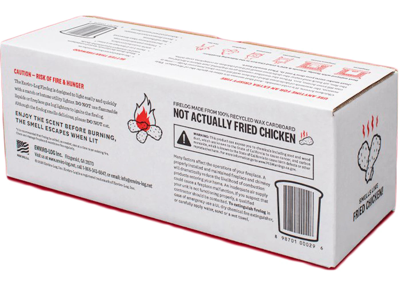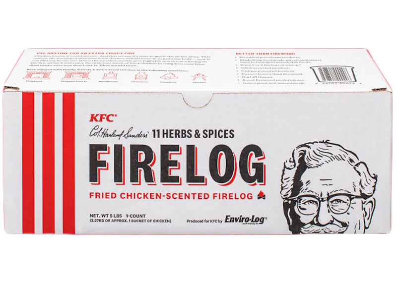 Envrio-Log partnered with KFC to launch a fried chicken scented firelog. The log is made to smell like the iconic eleven herbs and spices that KFC uses to perfect their world famous fried chicken. Exclusively released at Walmart during the 2019 holiday season, the Envrio-Log weighs just over 5 pounds and can burn for up to three hours.