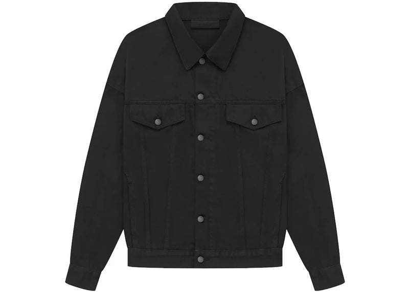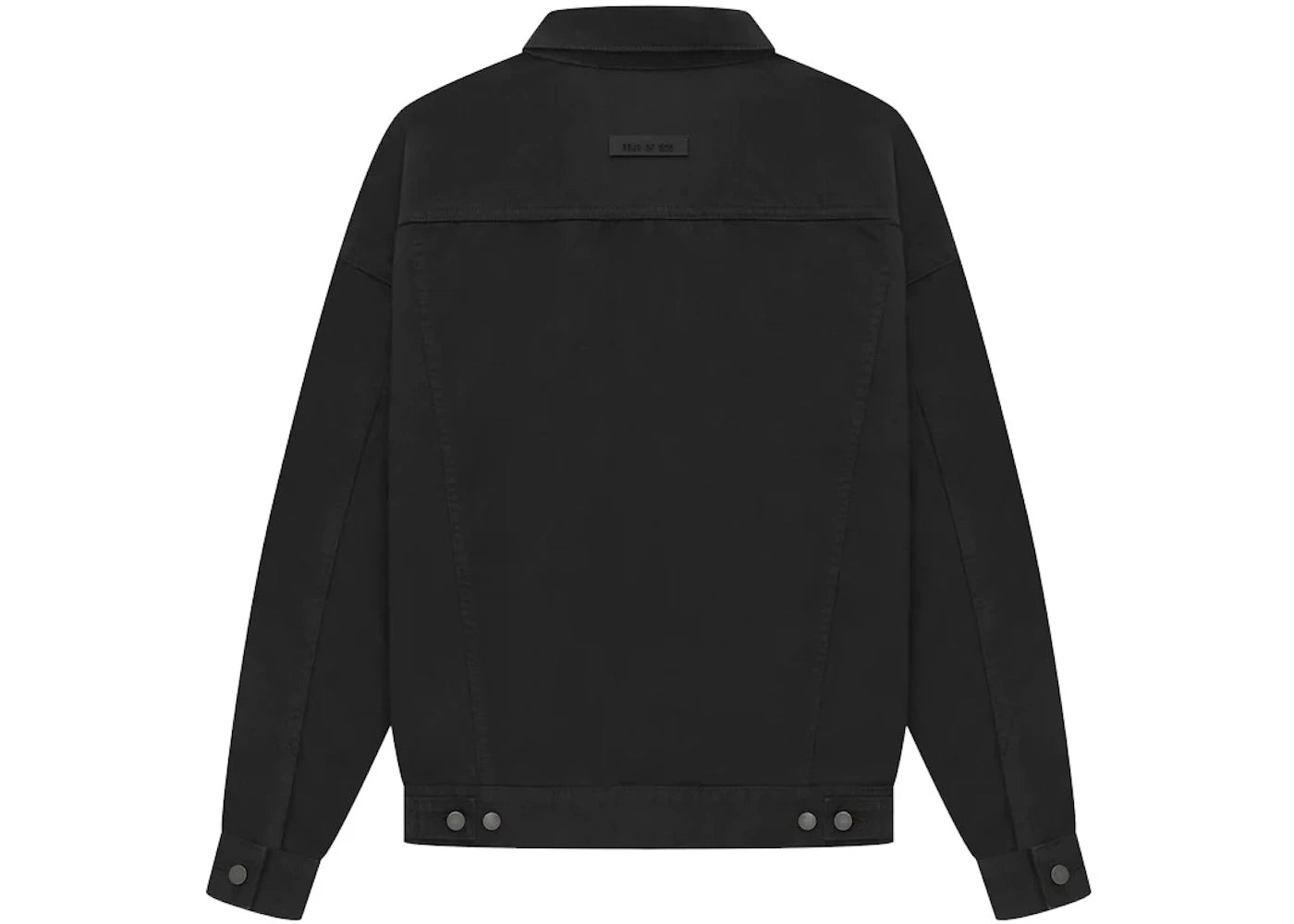 The Fear of God Essentials denim jacket features a subtle wash for a faded look with relaxed proportions and dropped shoulders. It includes antique black hardware, a point collar, 3-point pocket flaps, and side seam pockets. A rubberized label is placed at the back collar. Released on {date}, the Fear of God Essentials denim jacket is available now at Side Kicks.