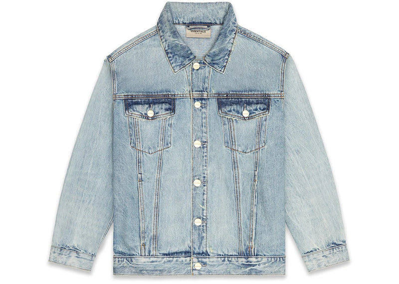 The Fear of God Essentials Denim Trucker Jacket Light Indigo is now available at Side Kicks!