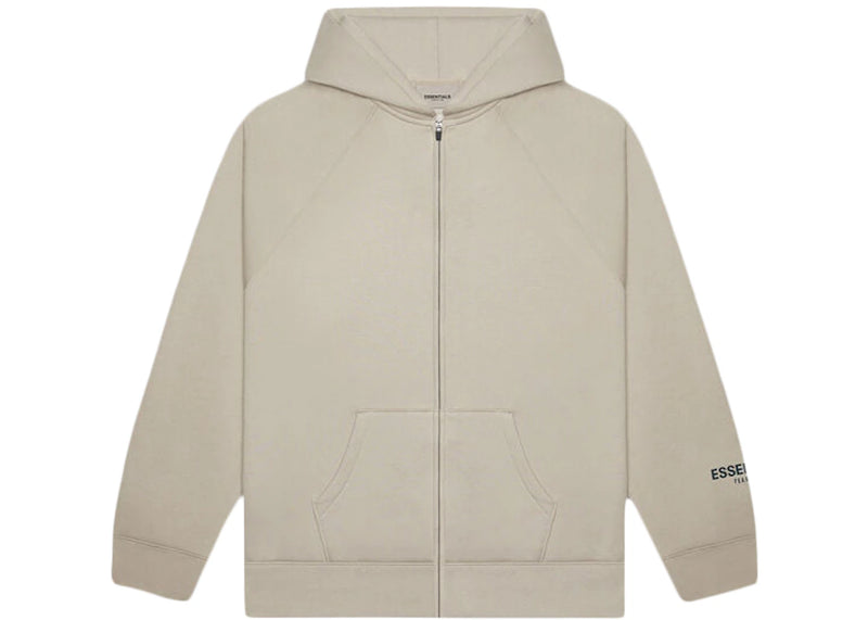 The FEAR OF GOD ESSENTIALS Basic Full Zip Up Hoodie in Oatmeal Heather features a cotton-polyester blend for softness and durability. Its full-zip design, hood, and front pockets offer practical layering options. The oatmeal heather color provides a neutral, versatile look. Released on July 1, 2020, the FEAR OF GOD ESSENTIALS Basic Full Zip Up Hoodie is available now at Side Kicks.