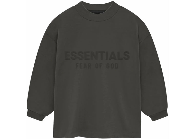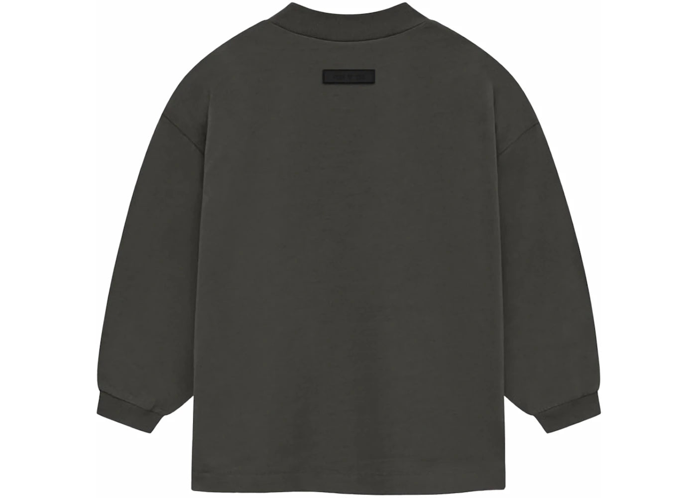 The Kids Essentials long sleeve T-shirt features a core cotton jersey construction with a rib-knit crewneck. It has a relaxed fit, dropped shoulders, and rib-knit cuffs. The center front displays a rubberized soft touch Essentials Fear logo, while the back collar includes a Fear of God rubberized label. Released on {date}, the Kids Essentials long sleeve T-shirt is available now at Side Kicks.