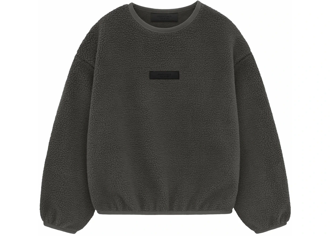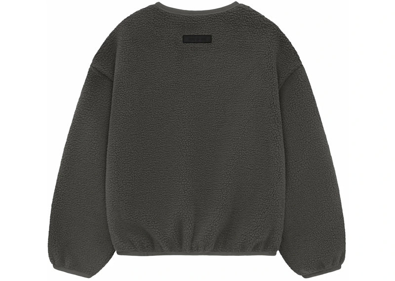 The Kids Essentials crewneck features a heavy 510-gram polar fleece construction with a voluminous, cropped silhouette. It includes a rubberized Essentials Fear of God black bar on the front, side seam pockets, and stretch binding at the neckline, cuffs, and hem. A rubberized Fear of God label is placed at the back collar. Released on {date}, the Kids Essentials crewneck is available now at Side Kicks.