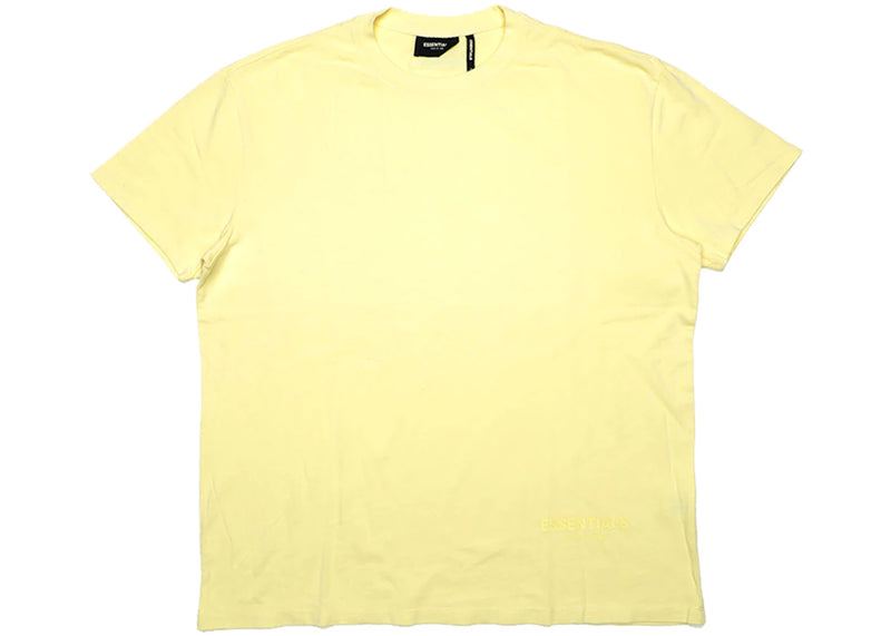 The Fear of God Essentials Lemonade Boxy T-shirt Yellow is a short-sleeved 100% cotton tee with a boxy silhouette, full shape, and slightly cropped fit. Made from lemonade yellow knit...