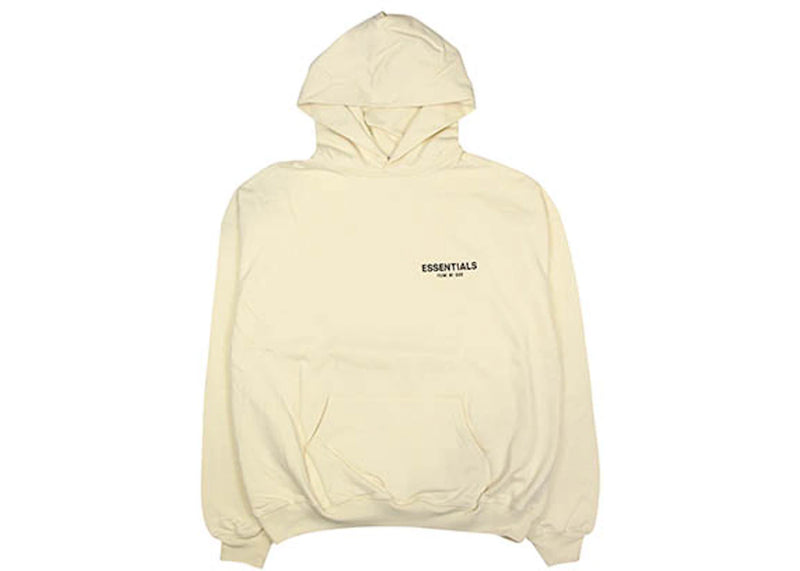 The Fear of God Essentials Logo Pullover Hoodie (SS19) Cream features a relaxed fit with long sleeves, made from a soft cotton blend. It includes an elasticized hem, cuffs, and a kangaroo pouch pocket. The left chest displays subtle "Essentials" branding with "Fear of God" in smaller lettering below. Released on April 11, 2019, the Fear of God Essentials Logo Pullover Hoodie (SS19) Cream is available now at Side Kicks.