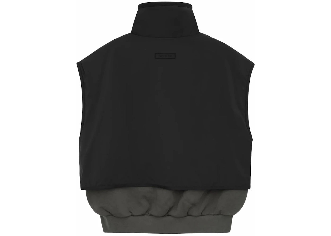 The Essentials mock neck vest features a core fleece construction with a stretch nylon shell, inspired by 90s layered styling. It has a voluminous, round, and cropped silhouette with a mock neckline, side seam pockets, and rib-knit waist hem. Minimalist branding includes a rubberized Essentials Fear of God black bar on the front and a Fear of God label at the back collar. Released on {date}, the Essentials mock neck vest is available now at Side Kicks.