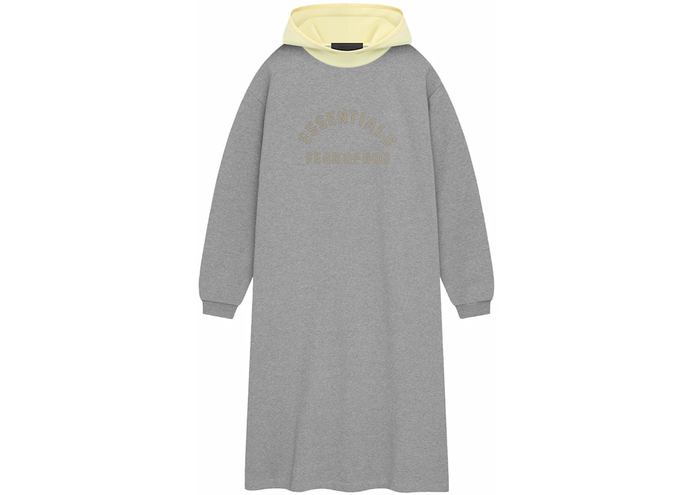 The Fear of God Essentials Women's Nylon Fleece Hooded Dress Dark Heather Oatmeal/Garden Yellow is now available at Side Kicks!