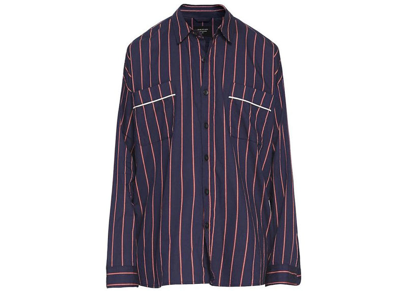 The Fear of God Piped Oversized Shirt Navy/Red Stripe is now available at Side Kicks!