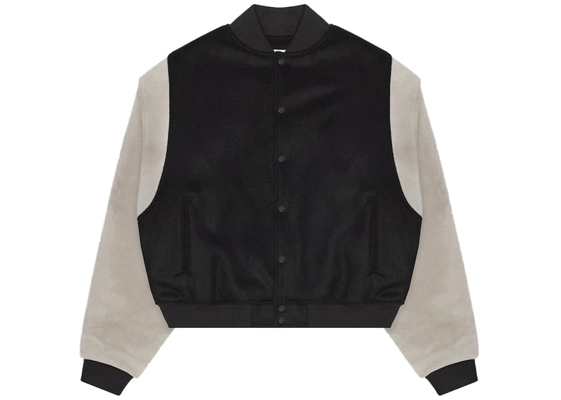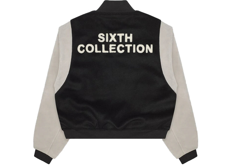 The Fear of God Sixth Collection Paneled Varsity Jacket Black/Grey is now available at Side Kicks!