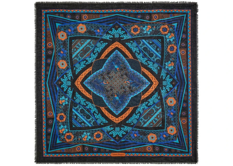 The Ferragamo Sl Nirvana Scarf Black/Turquoise Multicolor is now available at Side Kicks!