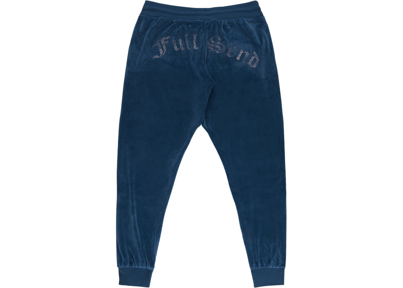 The Full Send Rhinestone Velour Track Pants Blue is now available at Side Kicks!