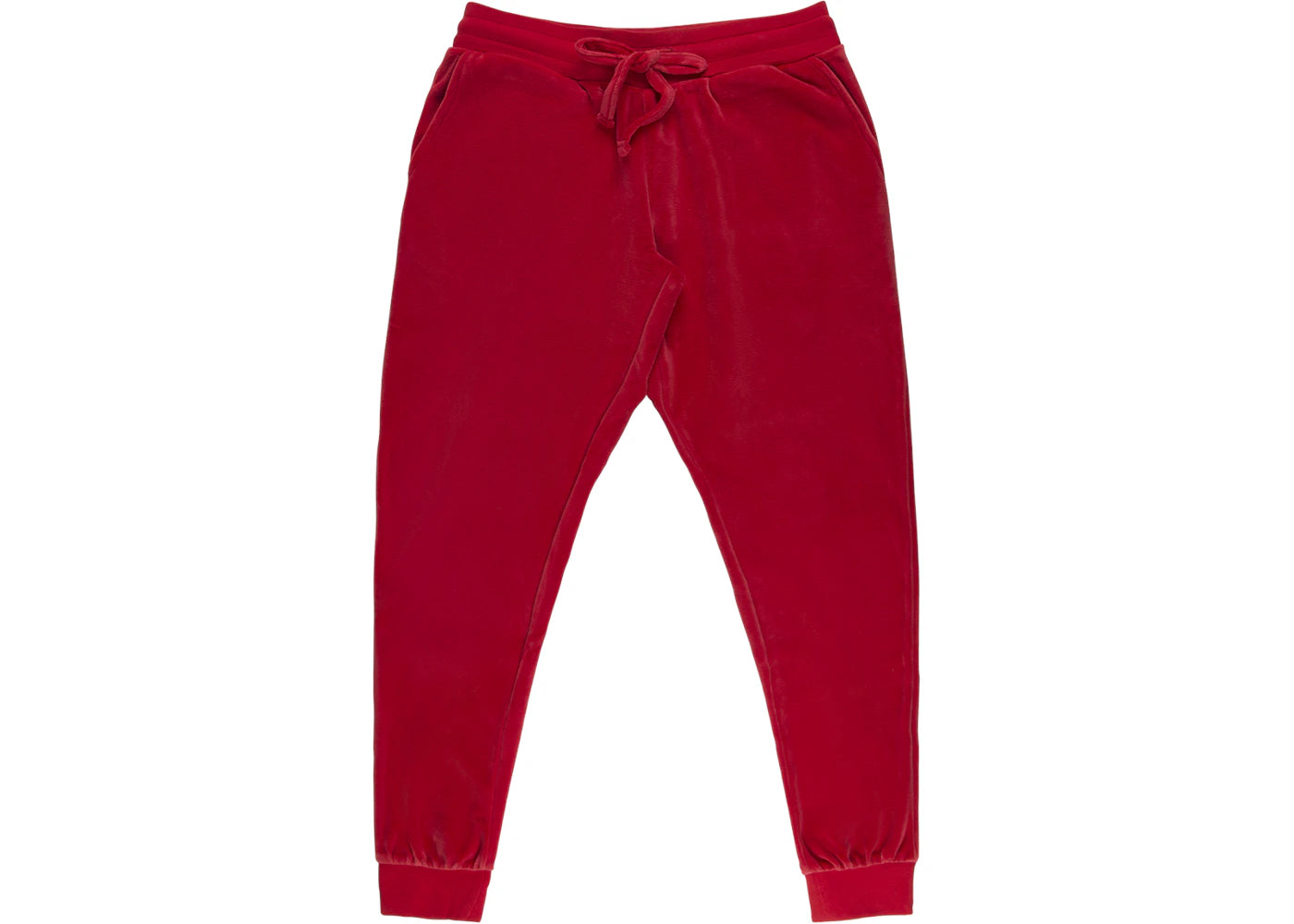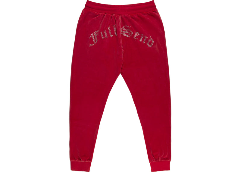 The Full Send Rhinestone Velour Track Pants Red is now available at Side Kicks!