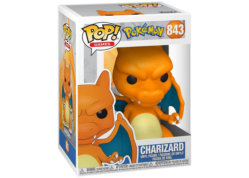 The Funko Pop! Games Pokémon Charizard Figure #843 showcases the iconic Fire-type Pokémon in a stance ready for battle with its fire tipped tail stretched out to its right hand side. The vinyl Charizard figure stands nearly 4 inches tall, and is the 843rd figure in the Funko Pop! Games series.