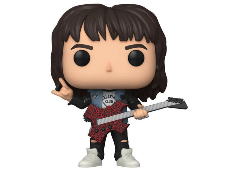 Grab a collectible from your favorite binge worthy TV series with the Funko Pop! Stranger Things Eddie Figure. The Stranger Things Eddie Figure is the 1250 figure in the Television series and is an exclusive to retailer Target. The figure was released just in time for Stranger Things Season 4 and sold out instantly. Eddie is wearing his Hellfire Club T-Shirt, blue denim vest and is rocking out with his black and red guitar.