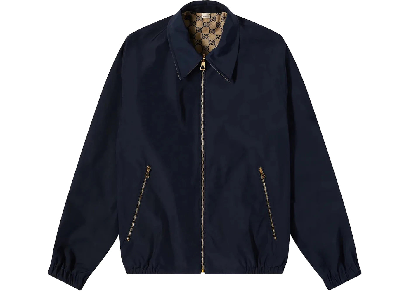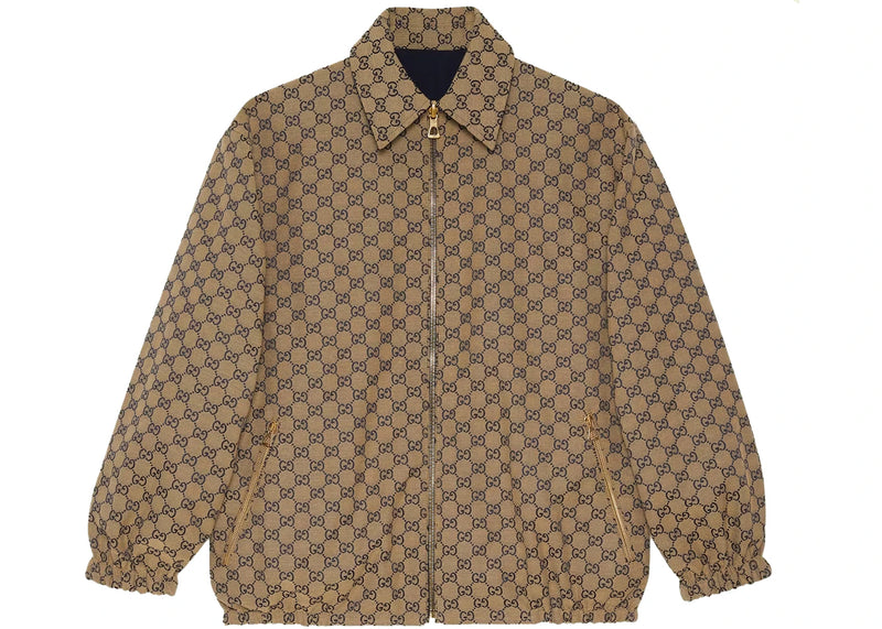 The Gucci All Over GG Harrington Reversable Jacket Beige Navy is now available at Side Kicks!