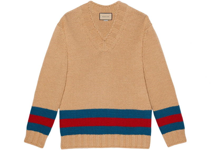 The Gucci Fine Mohair Wool Webbed Sweater Camel/Red/Green is now available at Side Kicks!