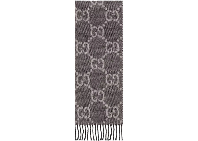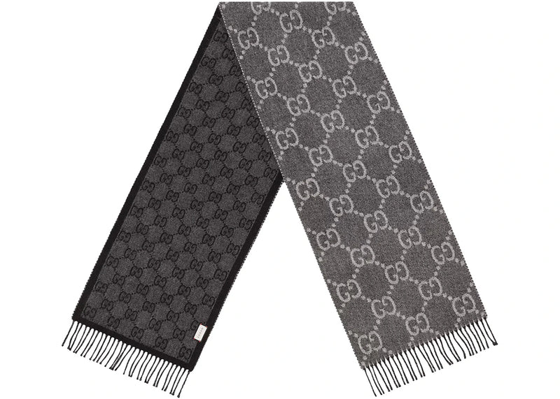The Gucci GG Jacquard Pattern Knit Scarf with Tassels Grey/Black is now available at Side Kicks!