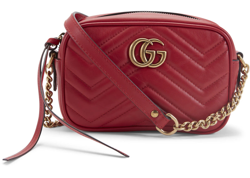 The Gucci GG Marmont Camera Bag Matelasse Mini Hibiscus Red is now available at Side Kicks!