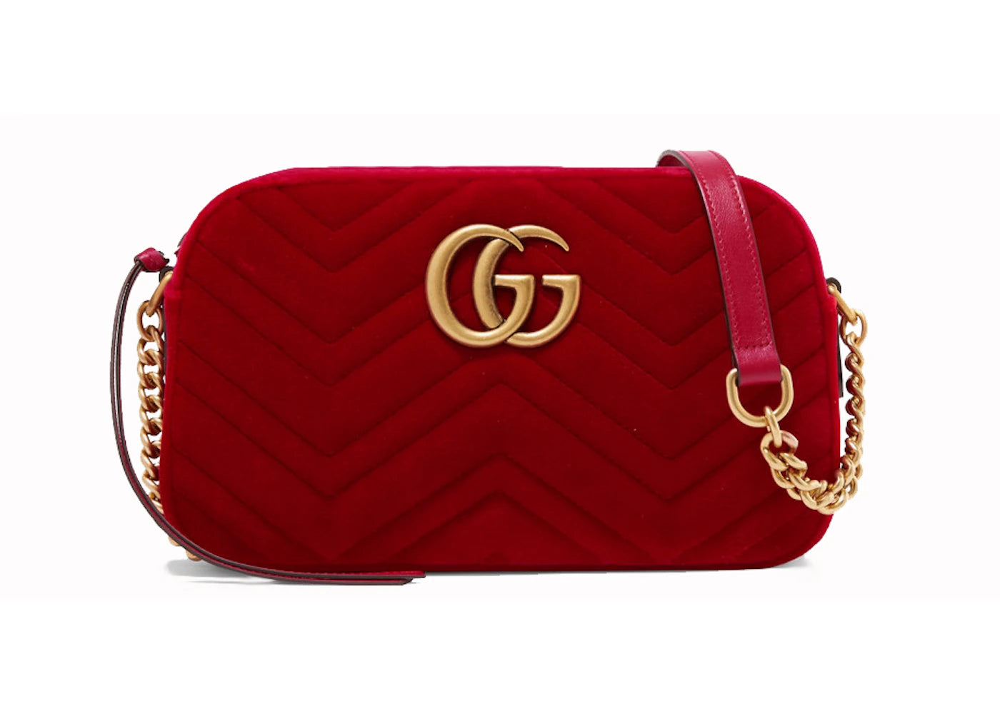 The Gucci GG Marmont Camera Bag Matelasse Velvet Small Hibiscus Red is now available at Side Kicks!