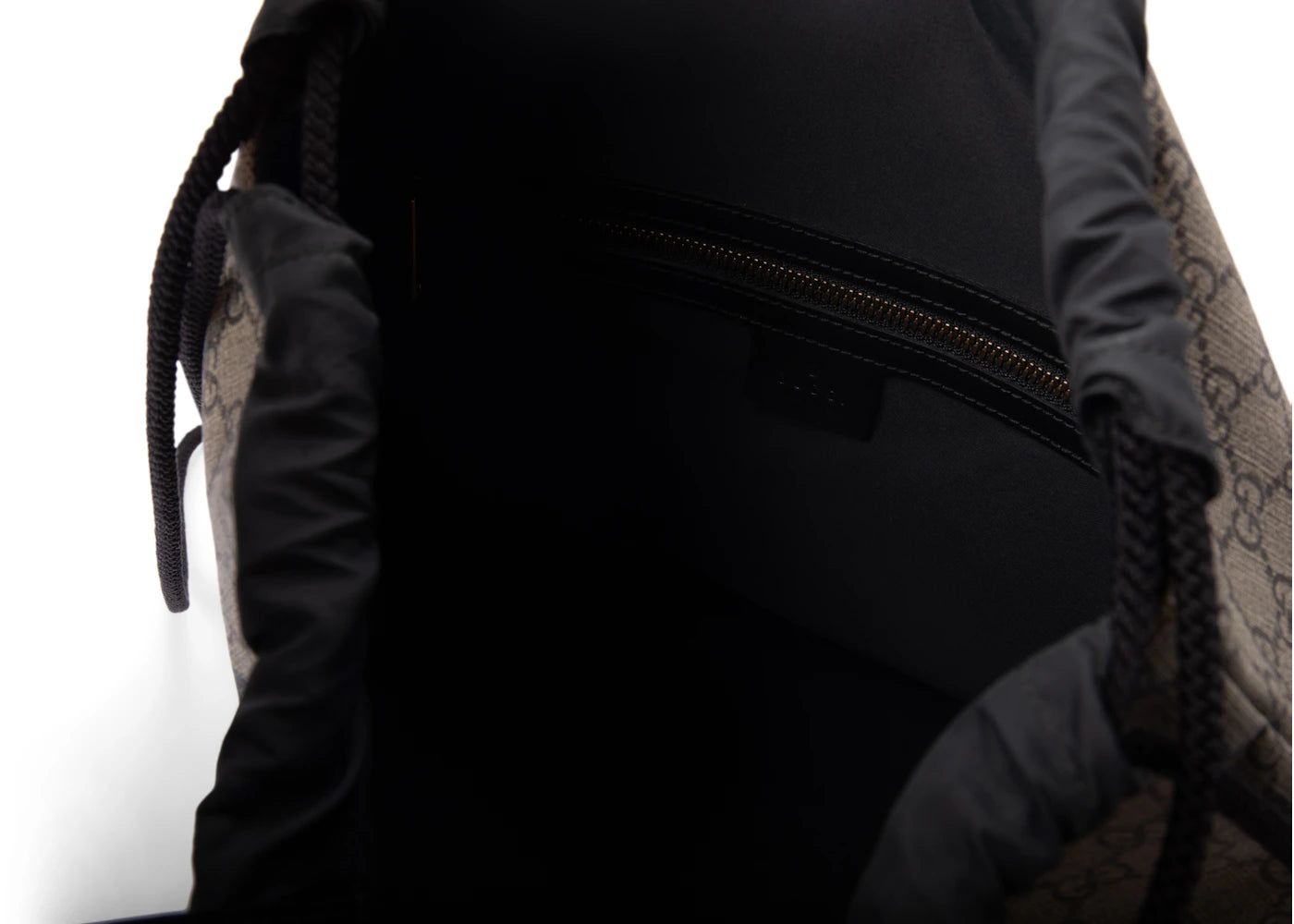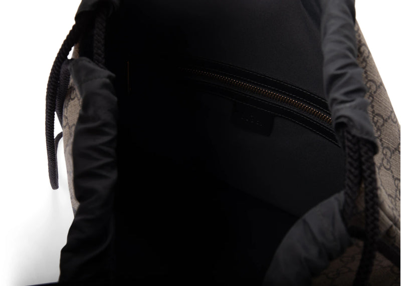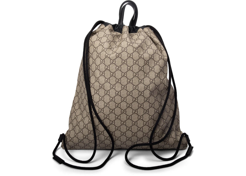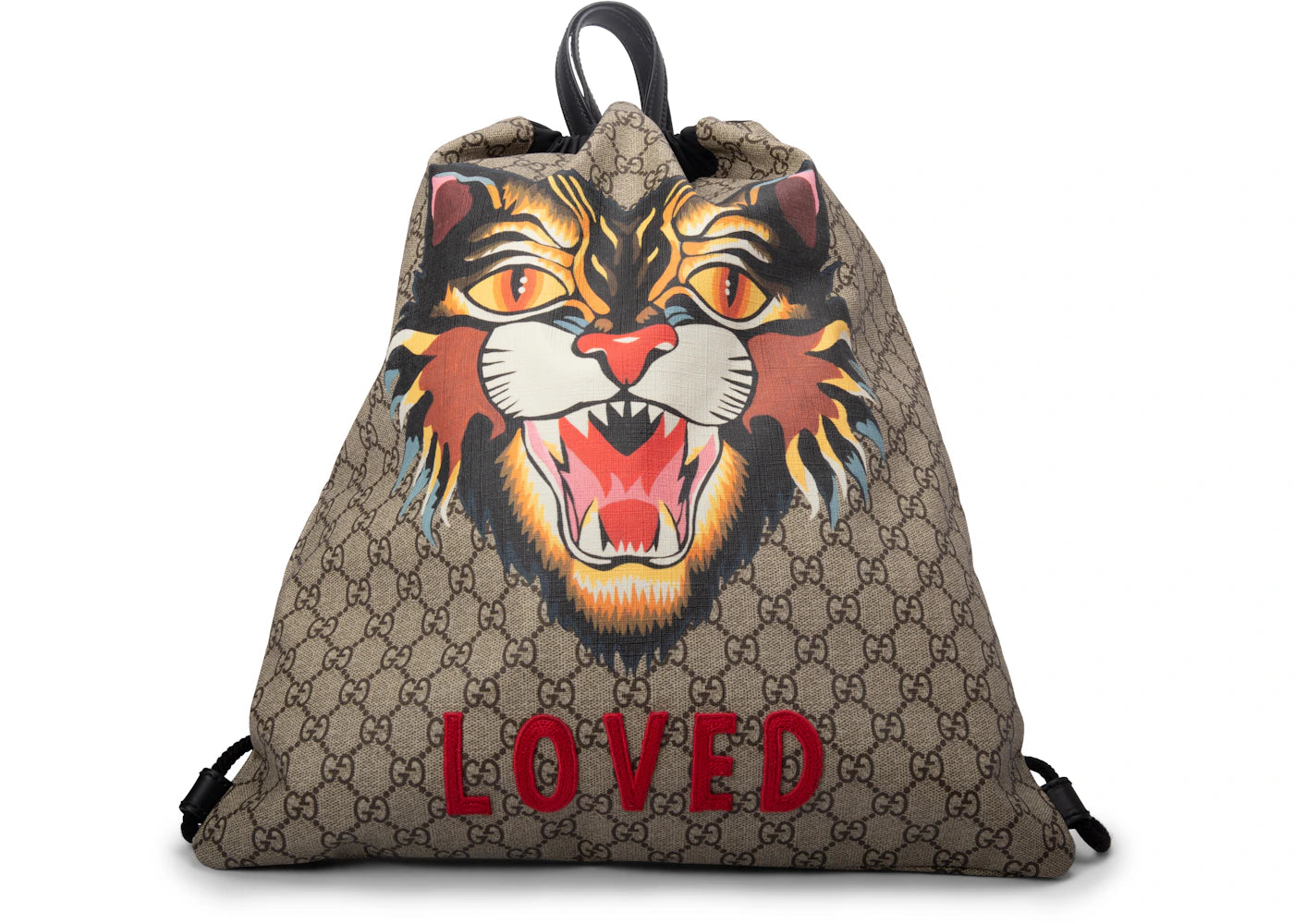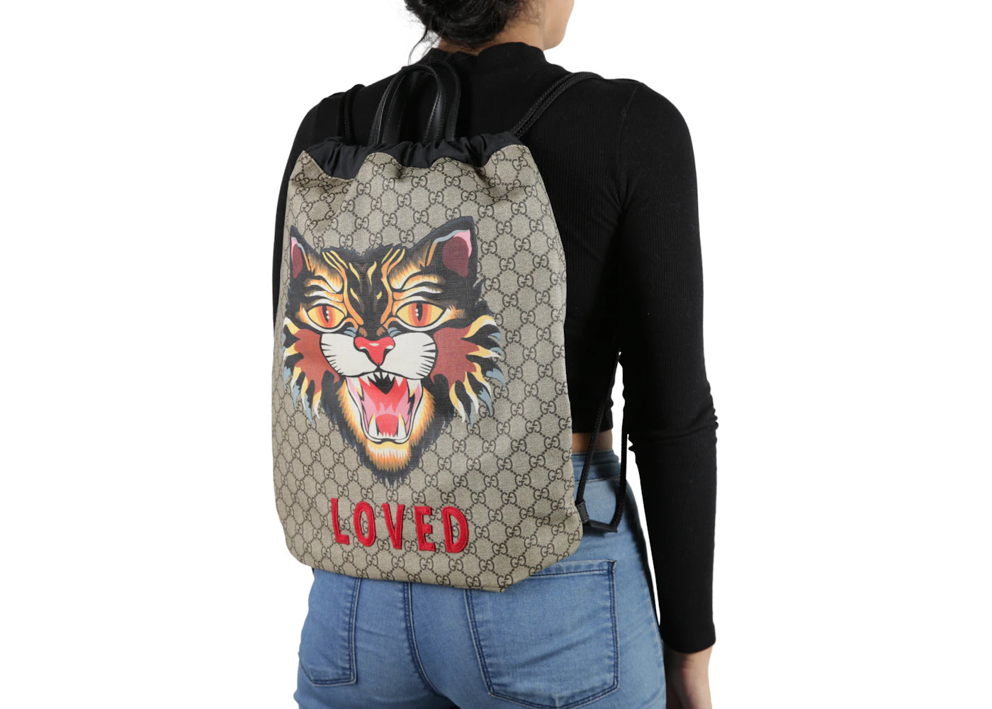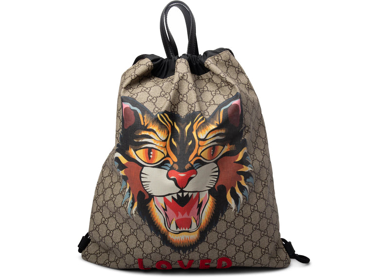 The Gucci GG Supreme Soft Drawstring Backpack Angry Cat Print Beige/Black is now available at Side Kicks!