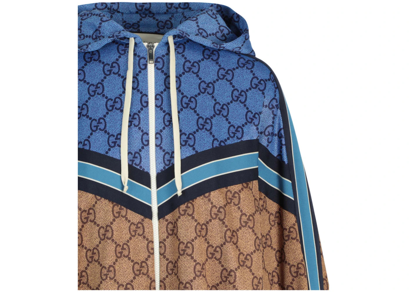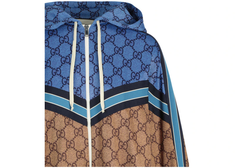 The Gucci Oversized Technical Jersey Long Jacket Vintage Camel/Multi is now available at Side Kicks!