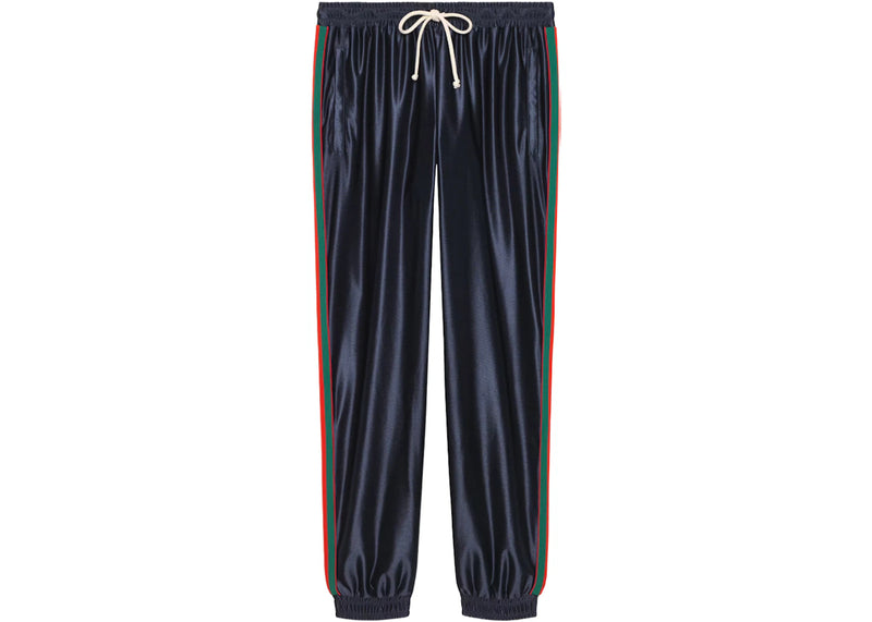 The Gucci Shiny Jersey Pant With Web Blue is now available at Side Kicks!