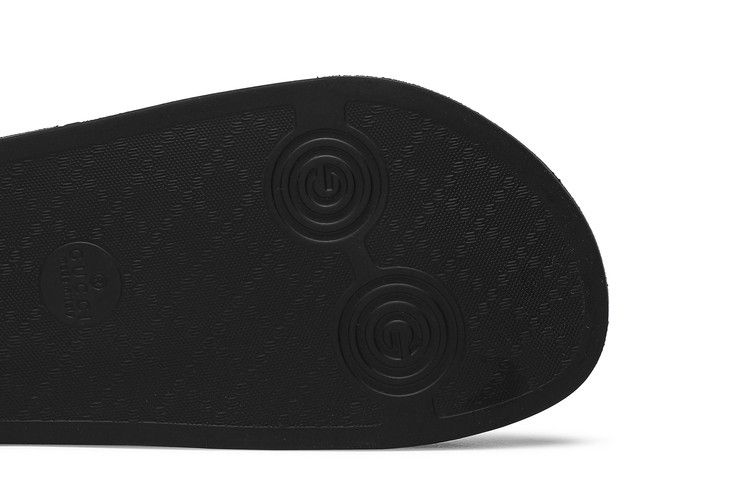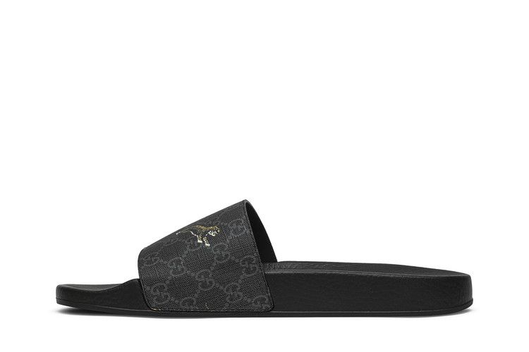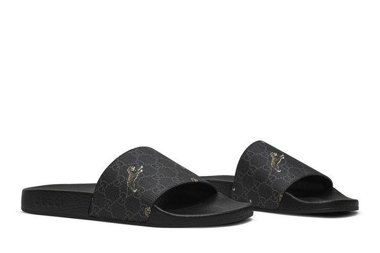 The Gucci Slide GG Supreme Tigers features a flat slip-on design with a thick black outsole and GUCCI branding on the heel. The wide upper strap showcases subtle GG Supreme...