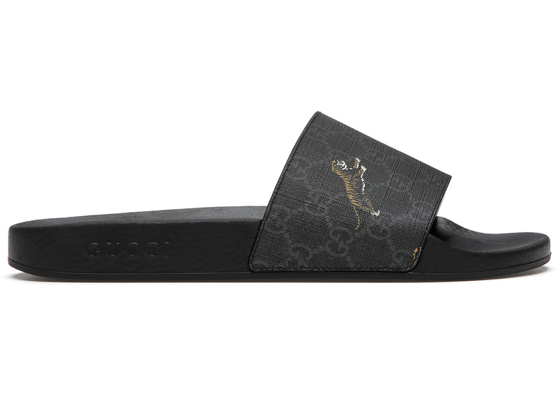 The Gucci Slide GG Supreme Tigers features a flat slip-on design with a thick black outsole and GUCCI branding on the heel. The wide upper strap showcases subtle GG Supreme logos and two tiger motifs, inspired by the brand's heritage. Designed for casual wear, it offers comfort with an open-toe silhouette. Released on June 1, 2019, the Gucci Slide GG Supreme Tigers is available now at Side Kicks.