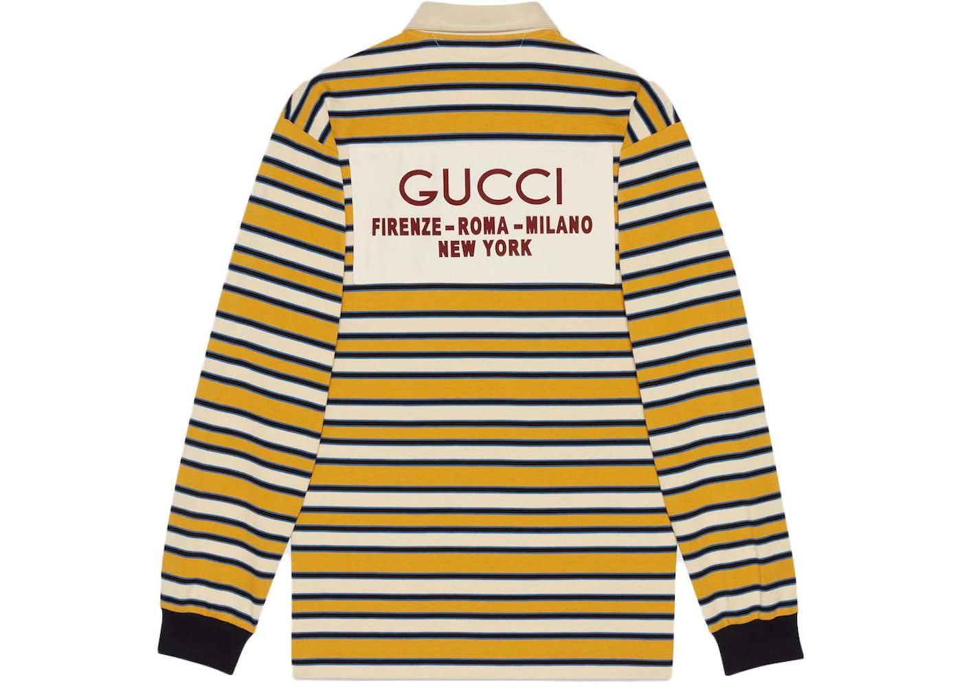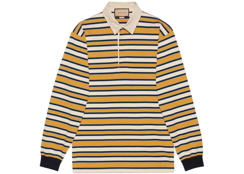 The Gucci Striped Polo with Patch Yellow/Multicolor is now available at Side Kicks!