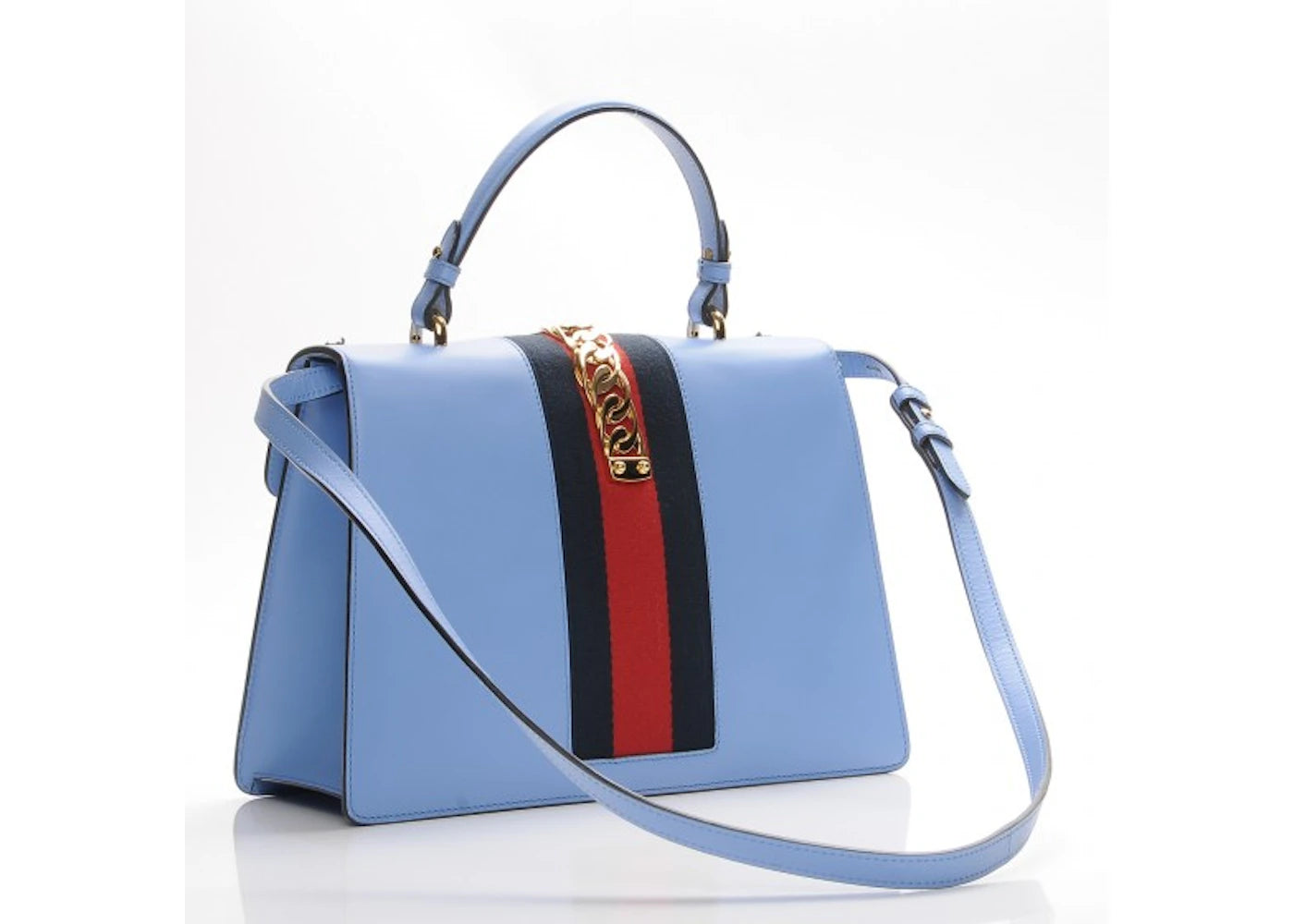 The Gucci Sylvie Top Handle Web Embroidered Medium Light Blue/Green/Pink/Red is now available at Side Kicks!