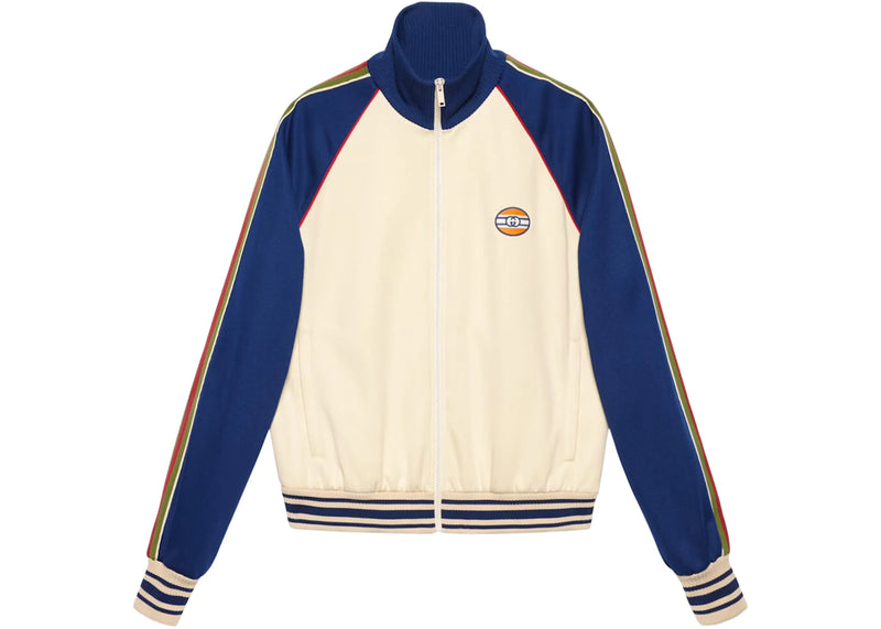 The Gucci Technical Jersey Zip-Up Jacket Ivory/Blue is now available at Side Kicks!