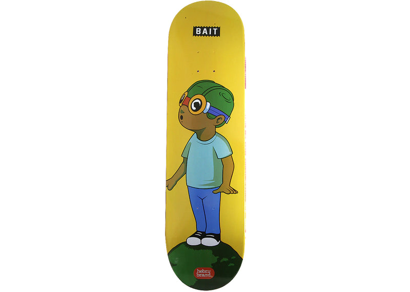 Bait collaborated with Hebru Brantley to develop the Hebru Brantley X Bait Fly Boy Skateboard Deck Yellow.A little kid wearing blue trousers, a green t-shirt, and a jungle green cap...