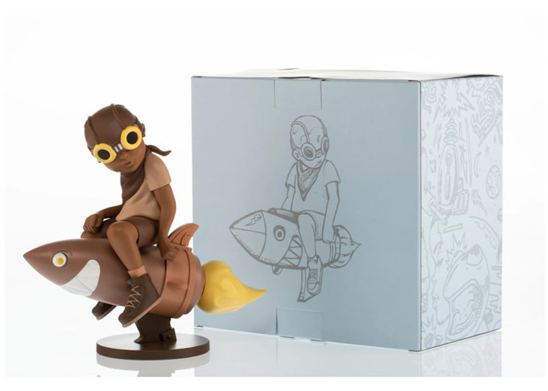 Chicago based contemporary artist Hebru Brantley collaborated with Bait and Billionaire Boys Club to put a vintage touch on his signature flyboy character. The sepia colored vinyl piece shows the yellow-eyed flyboy character on his bronze shark faced rocket. The figure measures nine inches high from the base.