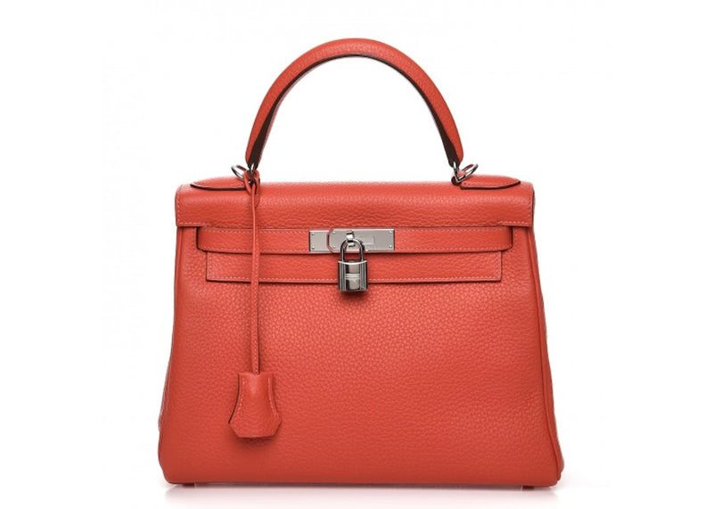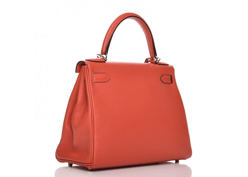 The Hermes Kelly Retourne Taurillon Clemence Palladium 28 Rouge Pivoine is now available at Side Kicks!