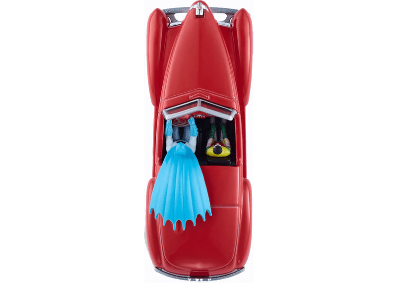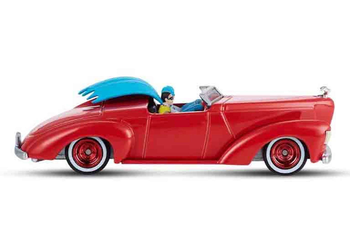 How Wheels released an exclusive DC Batman 1st Appearance Batmobile for San Diego Comic-Con 2021. The original Batmobile made its debut in May, 1939 in Detective Comics issue #27. The red car features a wing style rear and comes with red wheels and white wall tires. Batman and Robin are also seen inside the vehicle with Batman’s blue cape stretching out back going along with the car.