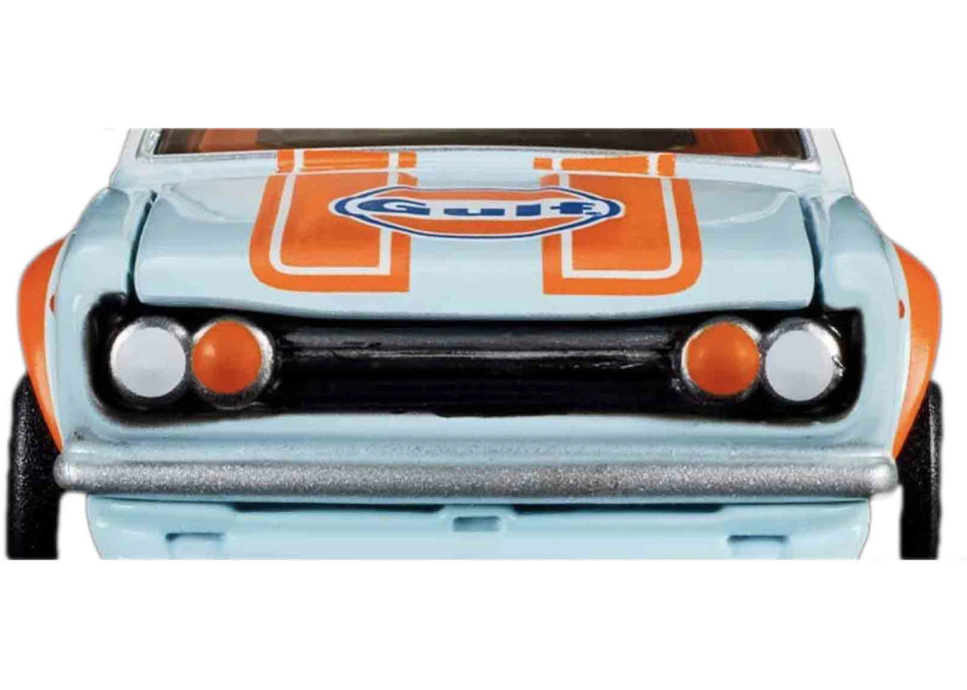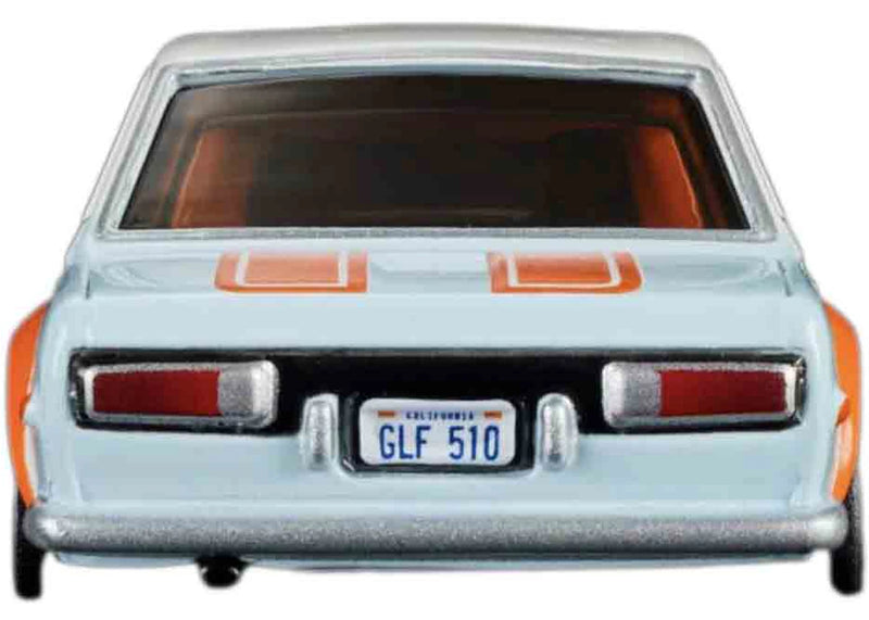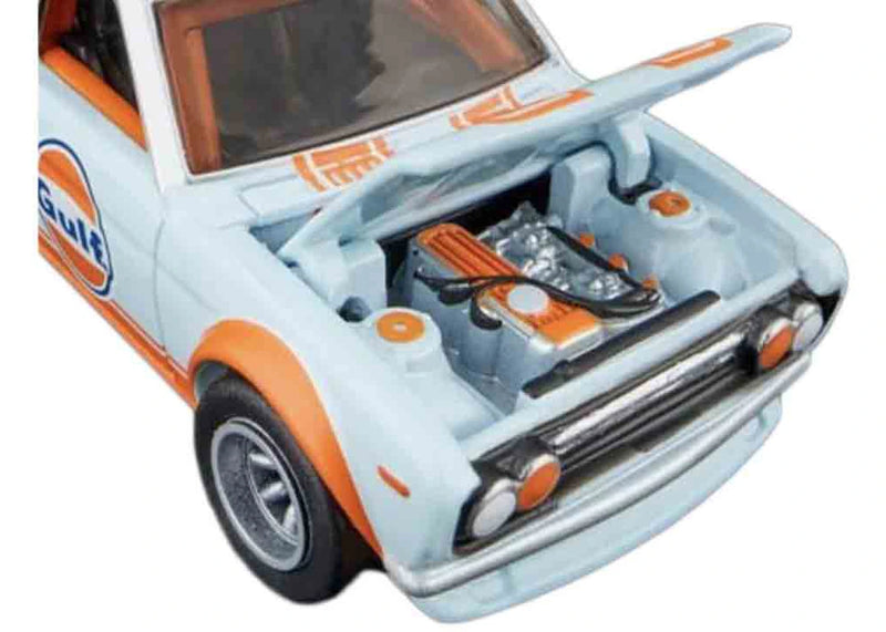 The Hot Wheels RLC Exclusive Datsun 510 features the iconic Datsun 510 with the "Gulf" logo, finished with an orange and sky blue wrap. The Hot Wheels RLC Exclusive Datsun 510 comes in a transparent case, perfect for your display case. Under the hood, the Hot Wheels RLC Exclusive Datsun 510 features the replica of the car's engine, unique California license plate, and the original tires of the Datsun 510.