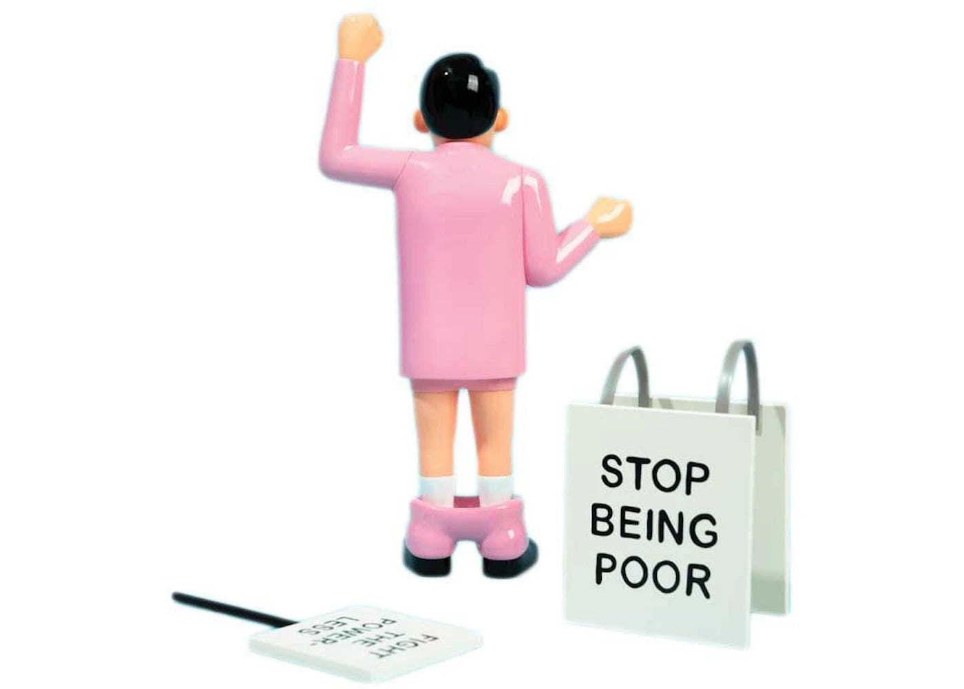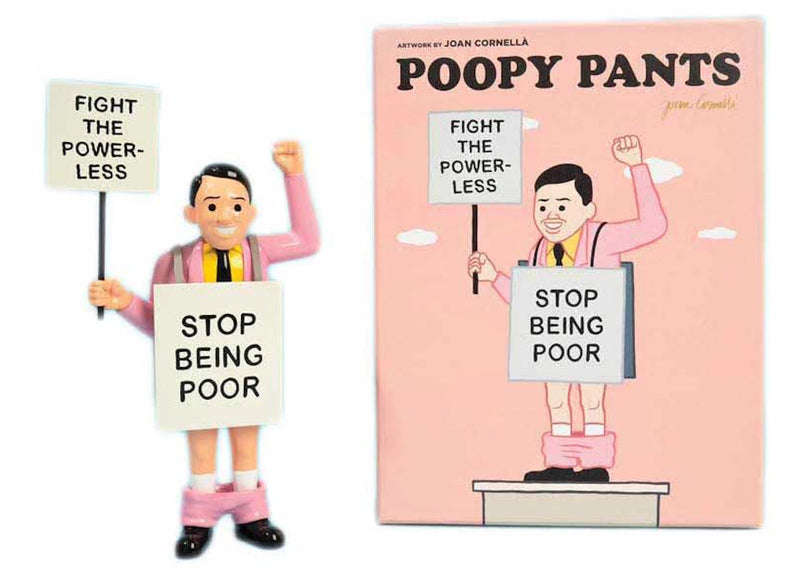 Standing at 10 inches tall is the Joan Cornella Poopy Pants Vinyl figure, which features a man in a pink suit with some protest signs. The man has his pants down to his ankles, and a sign over his chest reads "Stop Being Poor," while a sign in his right hand says "Fight The Powerless."