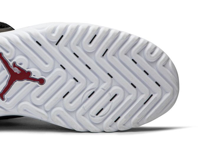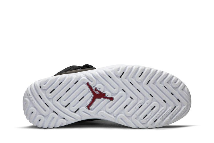 Modern Nike React cushioning provides responsive comfort. Neutral black and white shades are accented with gym red details, including branded tabs with Nike and Jumpman logos.