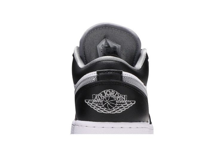 The Air Jordan 1 Low Black White Grey (GS) features a white leather base with black overlays and a grey Swoosh. It has a black cushioned tongue with grey Jumpman logo and a Wings emblem on the heel. Released in July 2021.