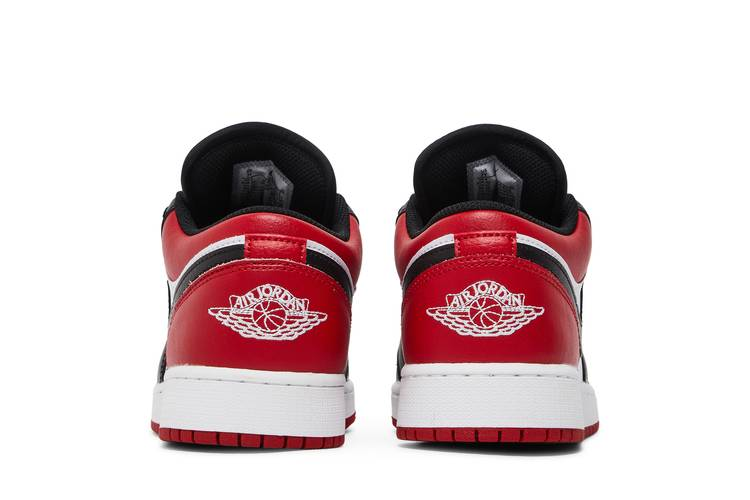 The grade school Air Jordan 1 Low Bred Toe GS showcases a black nylon tongue, Air Jordan Wings logo on the heel, and a white Jumpman logo. With a red...