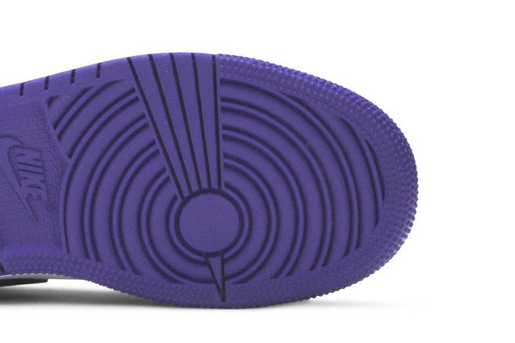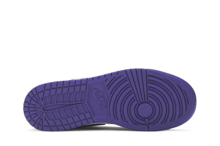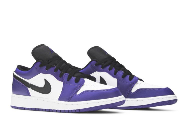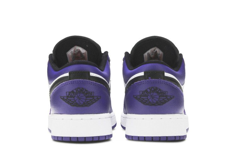 The Kids Air Jordan 1 Low Court Purple features a white leather upper with purple leather overlays, black laces, and Nike Swooshes on the sides. It includes a Jumpman logo on the tongue and a Wings logo on the heel. The shoe has a white midsole and purple outsole. Released in October 2020.