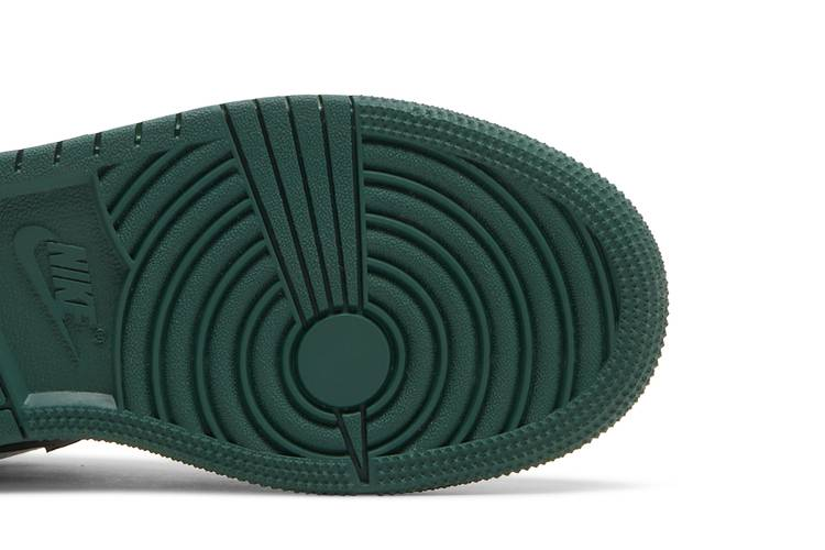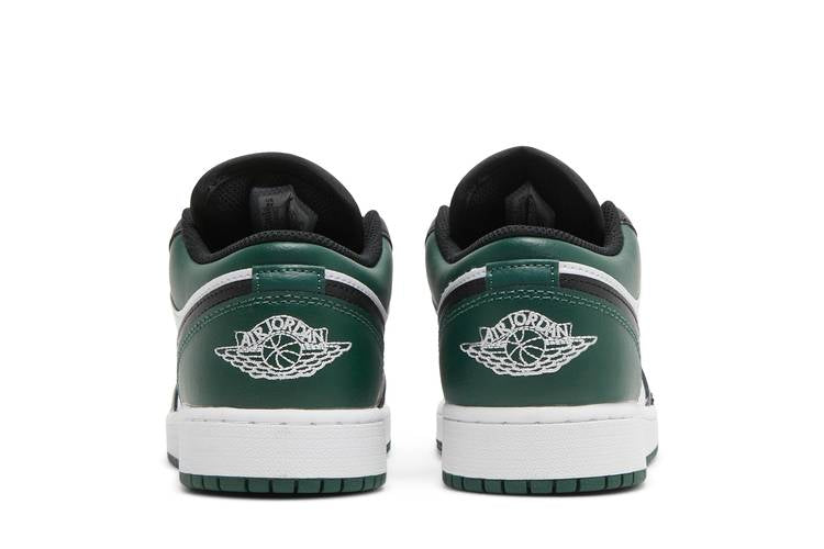 The Air Jordan 1 Low Green Toe (GS) features a green, black, and white color scheme with a striking gold Jumpman logo on the tongue. The shoe has a green and white sole and a black tongue and laces. The back of the shoe features the Air Jordan logo in white. Inspired by the classic Air Jordan 1 design, this shoe offers a unique twist on a timeless silhouette.