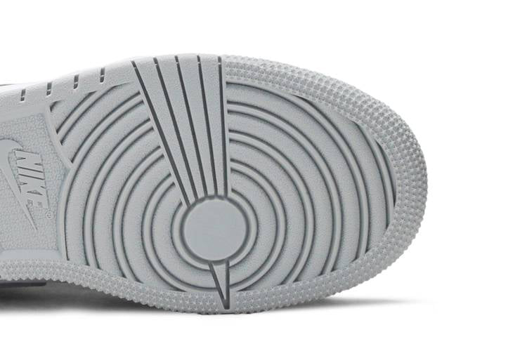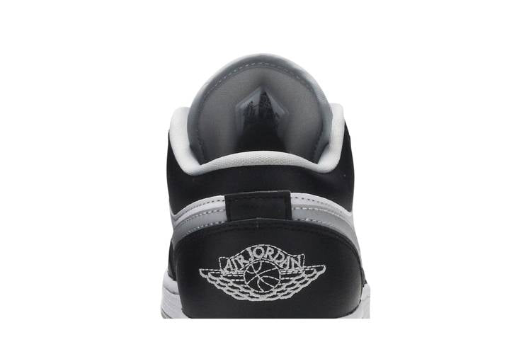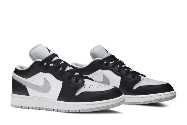 The Jordan 1 Low Grey Toe (GS) for kids showcases a white and black leather upper with grey accents slightly darker than white. The shoe features a white logo and winged Nike logo on the back. Released in 2020, this model offers a stylish and versatile design for young sneaker enthusiasts.