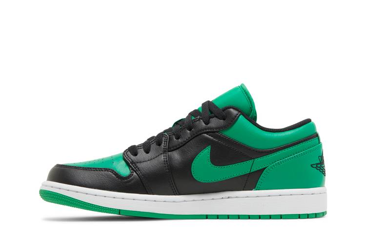 The Air Jordan 1 Low Lucky Green features a leather upper with a black finish on the quarter panel and forefoot overlay, accented by Lucky Green on the toe box,...