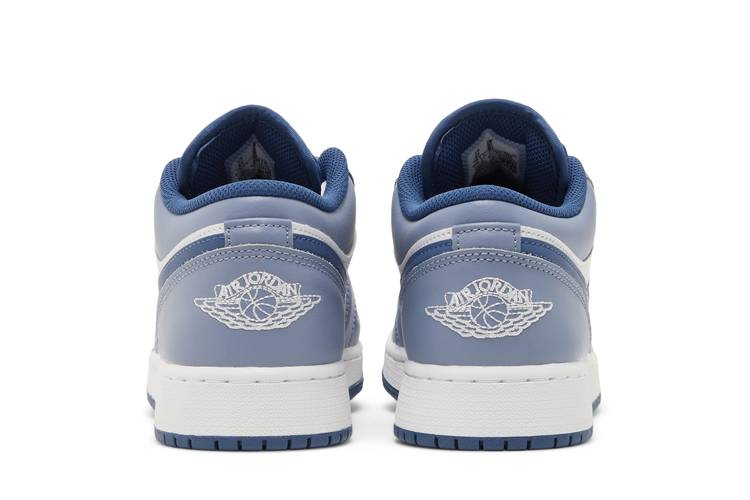 The Jordan 1 Low Slate Blue Navy (GS) is a grade school-sized shoe featuring a white leather base with Slate Blue and navy accents. The sneaker includes leather overlays, a navy Swoosh, and a nylon tongue with an embroidered Jumpman. The insole showcases a Jumpman logo, while the heel boasts a Wings logo. The shoe is completed with a white foam midsole and navy rubber outsole with Jordan branding.