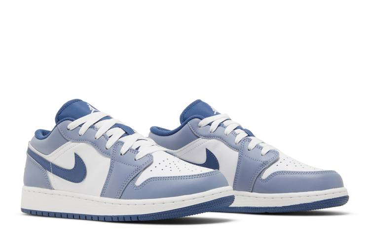 The Jordan 1 Low Slate Blue Navy (GS) is a grade school-sized shoe featuring a white leather base with Slate Blue and navy accents. The sneaker includes leather overlays, a...