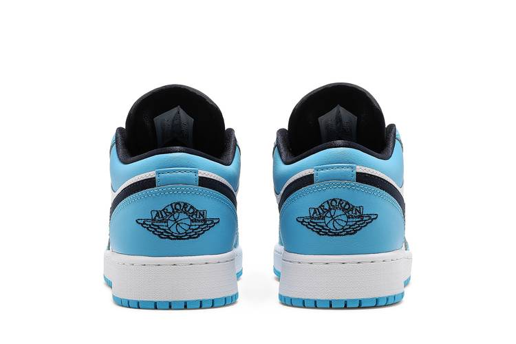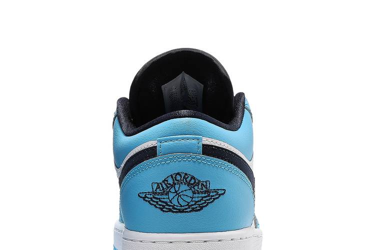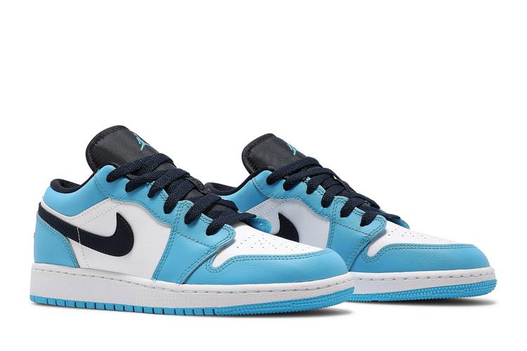 The Air Jordan 1 Low UNC 2021 (GS) features a white leather upper with University Blue overlays and obsidian Swoosh. Navy-blue accents on the laces, Wings, and tongue add contrast....