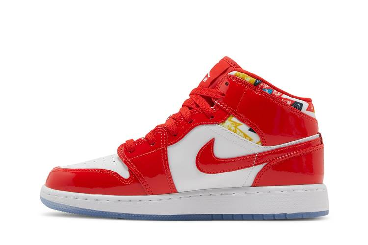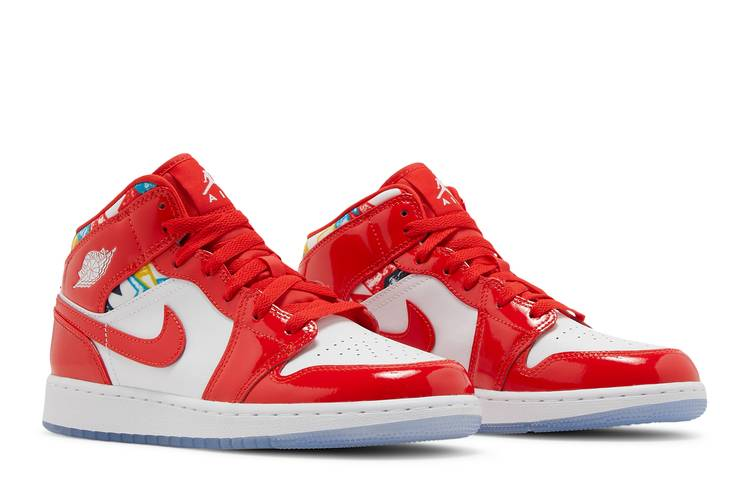 The Air Jordan 1 Mid Barcelona Sweater Red Patent (GS) is a grade school-sized shoe featuring a soft white leather upper with a perforated toe box. Chile red patent leather overlays adorn the heel, Swoosh, eyestays, forefoot, and toe cap. The collar showcases a multi-color abstract pattern inspired by Jordan's 1992 Olympics outfit. Additional details include a white Wings logo on the collar, a red tongue tag, and a white Jumpman on the red insole. The midsole is white, and the outsole is translucent white. Released on October 1, 2021.