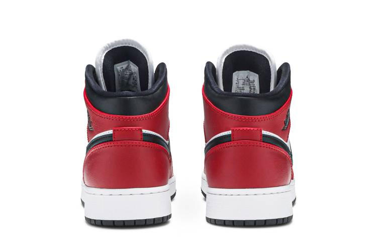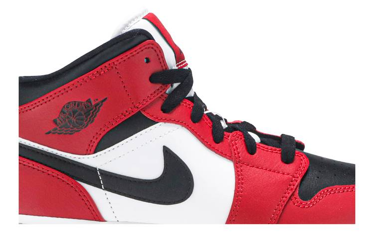 The Jordan 1 Mid Chicago Black Toe Kids shoe is crafted with a premium leather upper in black and red tones. The design includes black laces, "Swooshes," and outsole for...